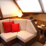 Soms heeft een mens geluk. We vinden een parkeerstek voor onze auto vlakbij de jachthaven aan de Lindelei. Er schijnt een mooie zonnetje, en wat later ontmoeten we de managers van Super Lauwersmeer en de booteigenaren aan boord van het statige motorjacht. Via het zwemplatform leidt een kronkeltrap (wat een mooi exemplaar) naar het achterdek, dat voor de gelegenheid is voorzien van een enorme buiskap. We zijn er klaar voor, en vragen meteen na de kennismaking om een blik te mogen werpen benedendeks.
